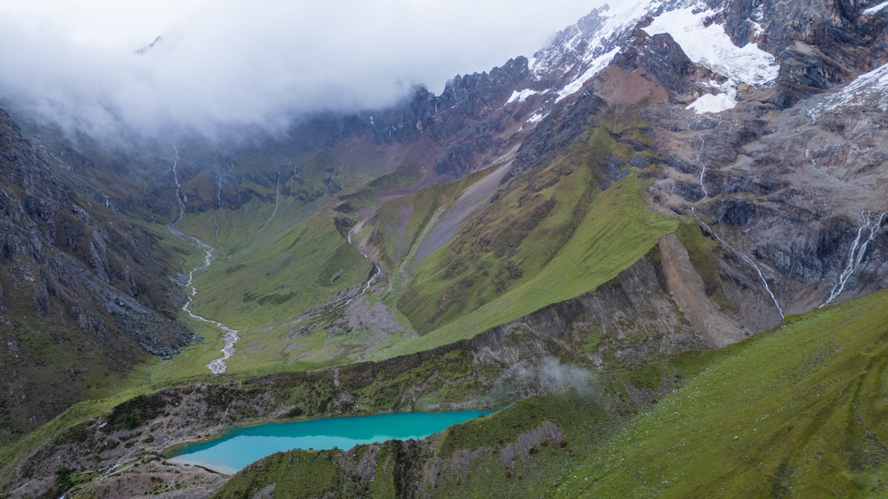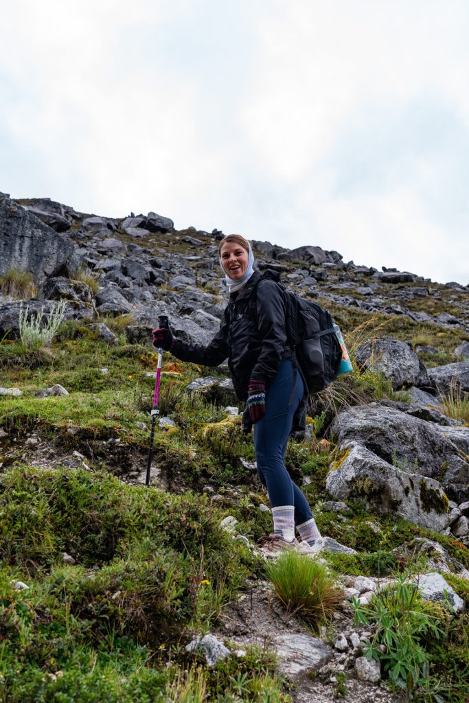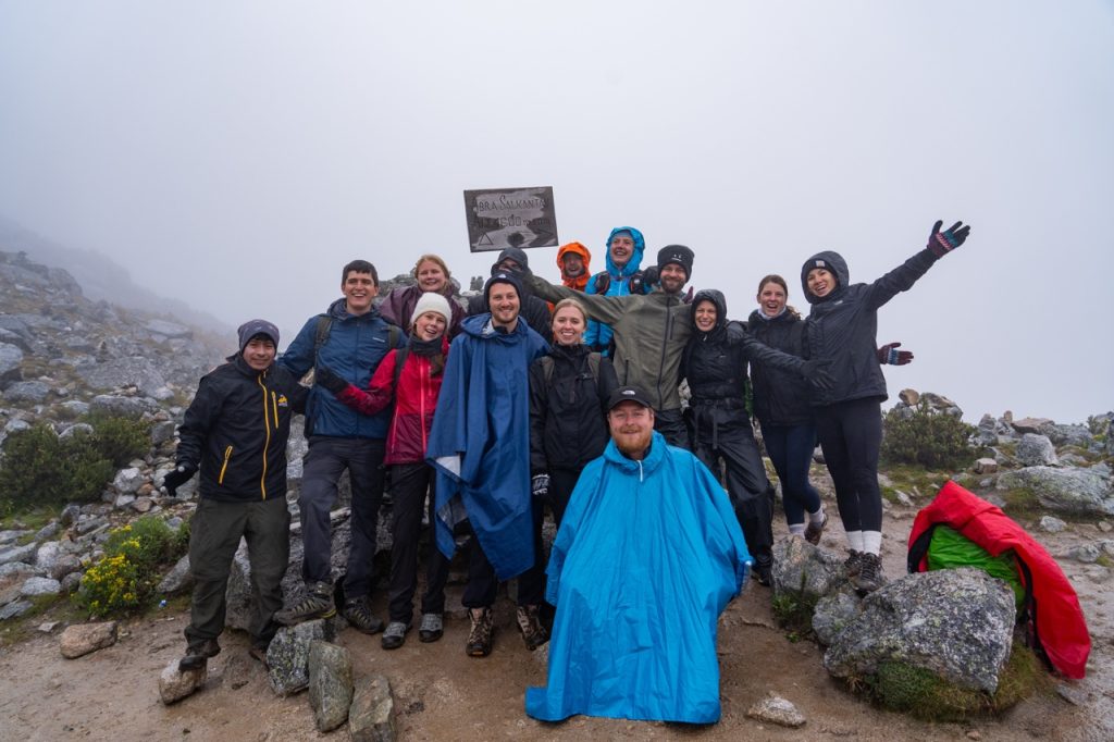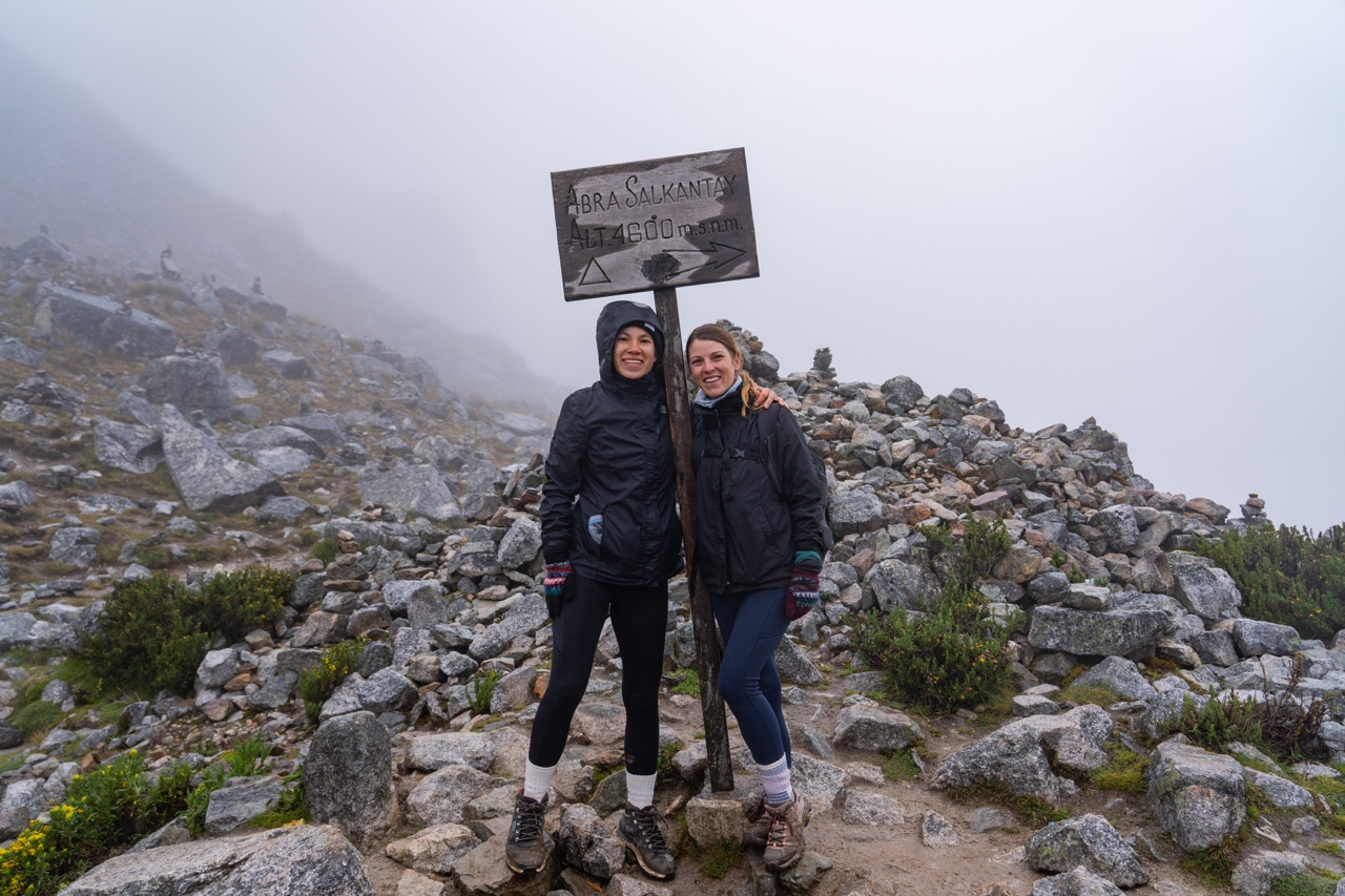 Although we were proud of ourselves for getting to the top very quickly, we soon came to regret our decision as we had to wait on top of the completely unprotected, rainy, freezing cold mountain pass for everybody else in our group to catch up. We tried to huddle behind a boulder to break the wind as we waited for everyone to join. Vidal passed around some coca leaves and snacks and told us there was just another 40 minutes up until we reached the top of Salkantay Pass.