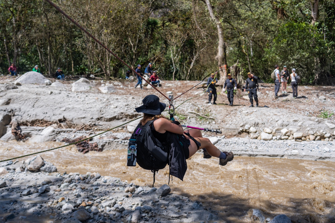 We finally arrived at the meeting point saw the landslide. It was bad. A huge portion of the path and been completely wiped away and in it’s place was a fast roaring river. But to our surprise, the local Peruvian military had set up a zipline where they were zip-lining people across! We waited in line as the military members expertly strapped us up into harnesses and pulled us across the roaring river.