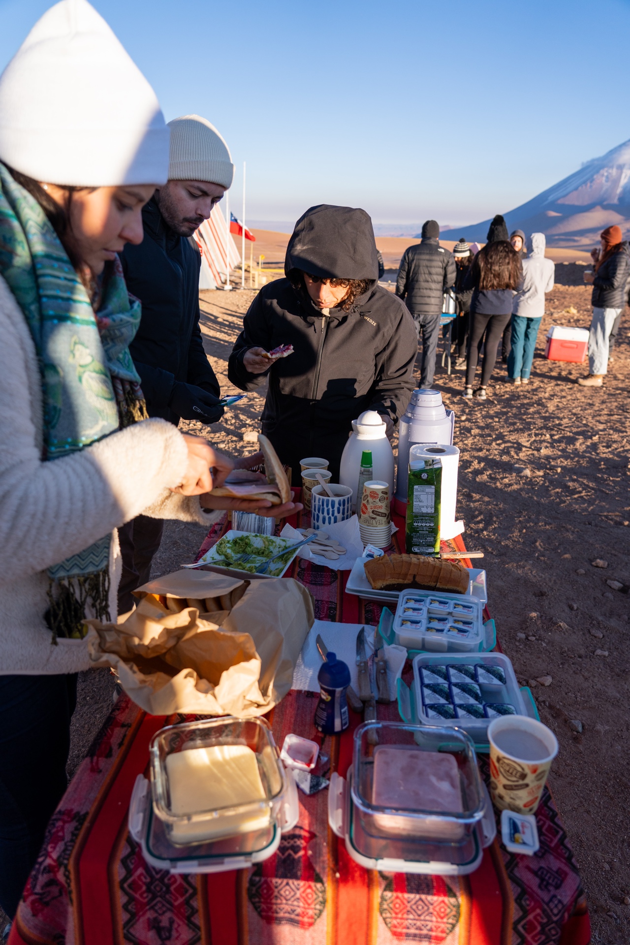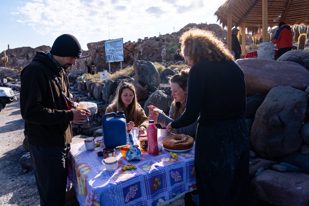 As we waited for the border station to open, our guides set up a breakfast picnic with fresh baked bread, guacamole, cheese, ham, coffee, tea, and hot chocolate. We huddled around our cups of hot tea trying to stay warm as we watched the sun rise over the mountains in the distance. Around 8 am, the border post finally opened and we lined up to stamp out of Chile.