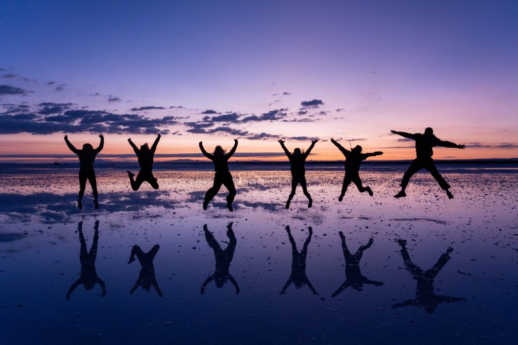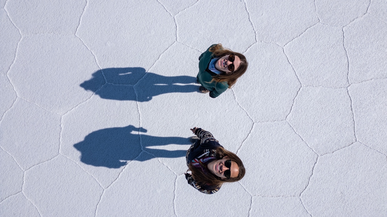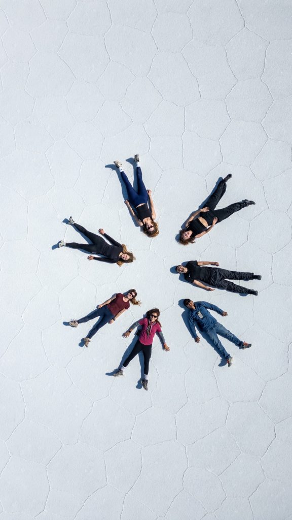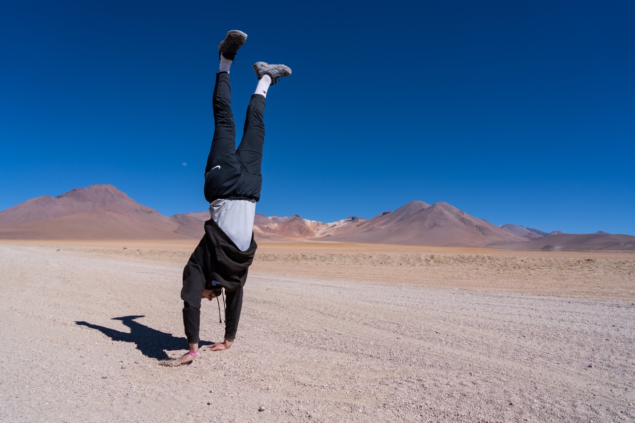 After breakfast, we had the classic Uyuni Salt Flats group photoshoot with creative perspective shots. Elvis had loads of props that he used to make it look like we were being chased by a dinosaur, climbing out of a Pringles can, and being stepped on by a giant foot, among others. We spent over an hour shooting different poses, including handstands and drone shots.