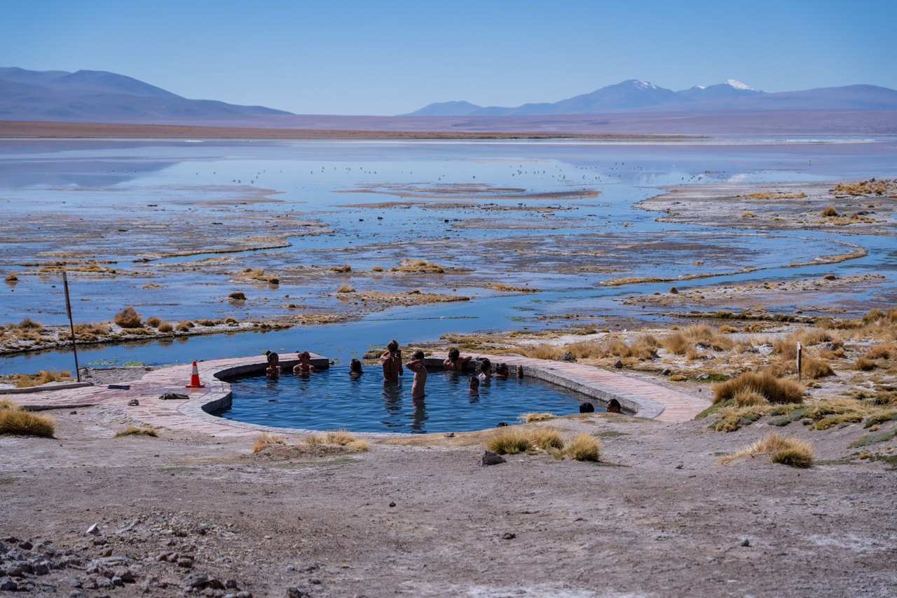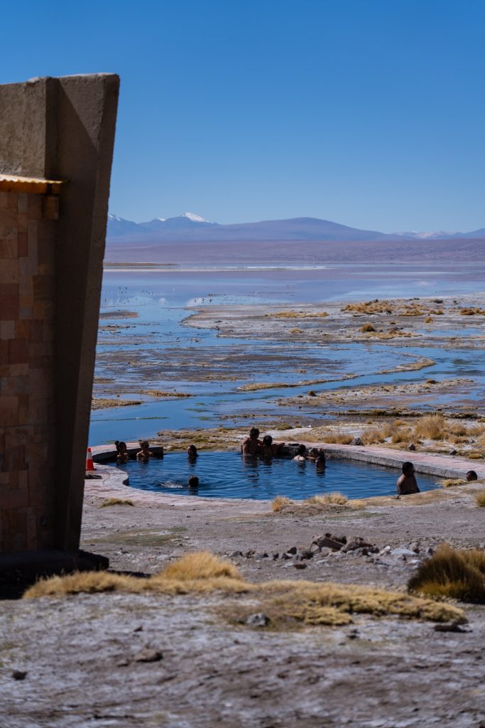 We quickly changed into our swimsuits and enjoyed the 38-degree hot water, continuing to chat with our tour group. We had a beautiful view of a big lake, and got to know our trip mates a little better. Sam and Lois were doing a similar trip to ours, but they were spending their entire 6-8 months in South America. They had started in Brazil and worked their way down to Patagonia, and were going to be following the route basically in reverse. Dana and Steffi were on a shorter 3 month trip, but were also really looking forward to heading to Peru after their time in Bolivia.