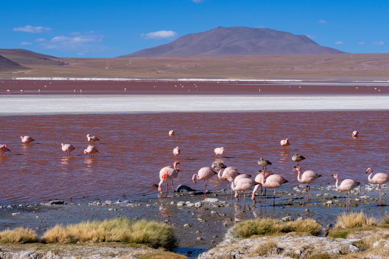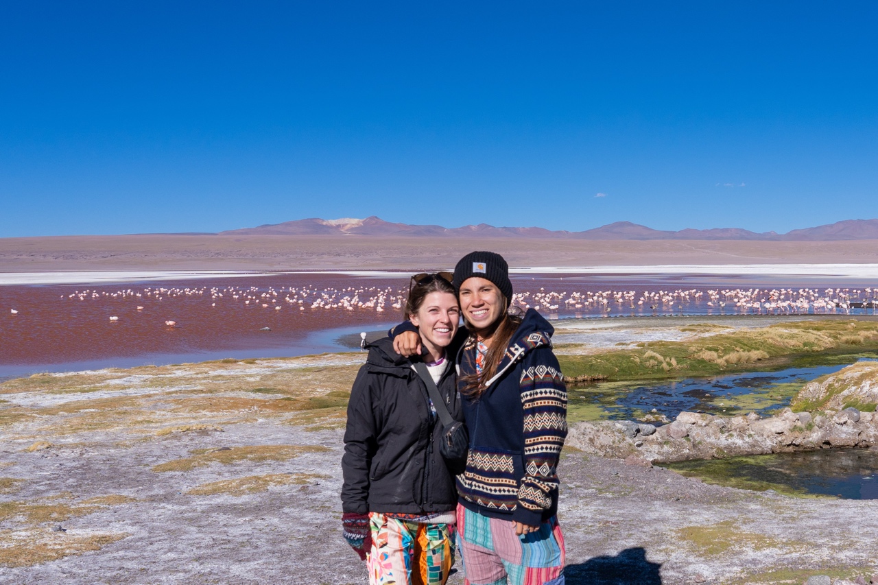 Our finally stop of the day was about a 2-3 hour drive across the bumpy unpaved roads to Laguna Colorada. Laguna Colorada, with its bright red waters, was home to hundreds, if not thousands, of flamingos. Everywhere we looked was straight out a postcard. The red lake stood out in striking contrast against the bright blue skies, and the thousands of flamingos were hilarious to watch. We had about an hour to enjoy the lake and take photos of the flamingos. Saz and I walked all along the lake, trying to get as close as we could to the flamingos.
