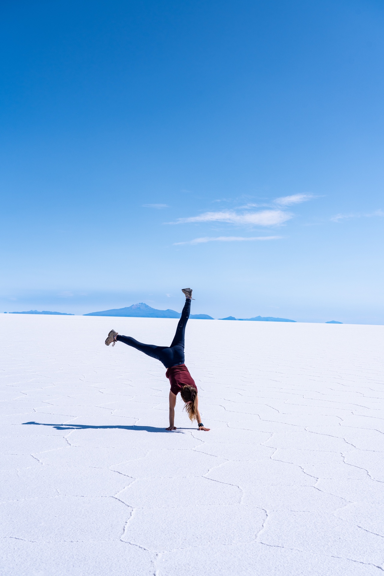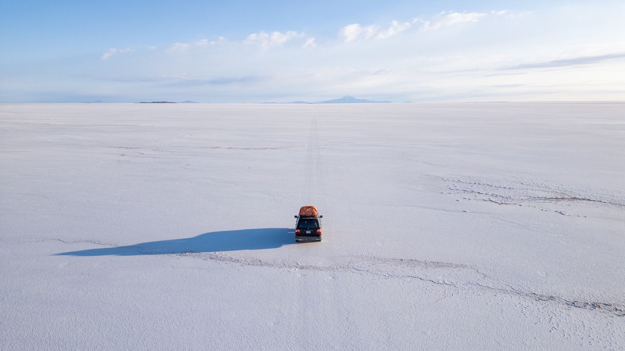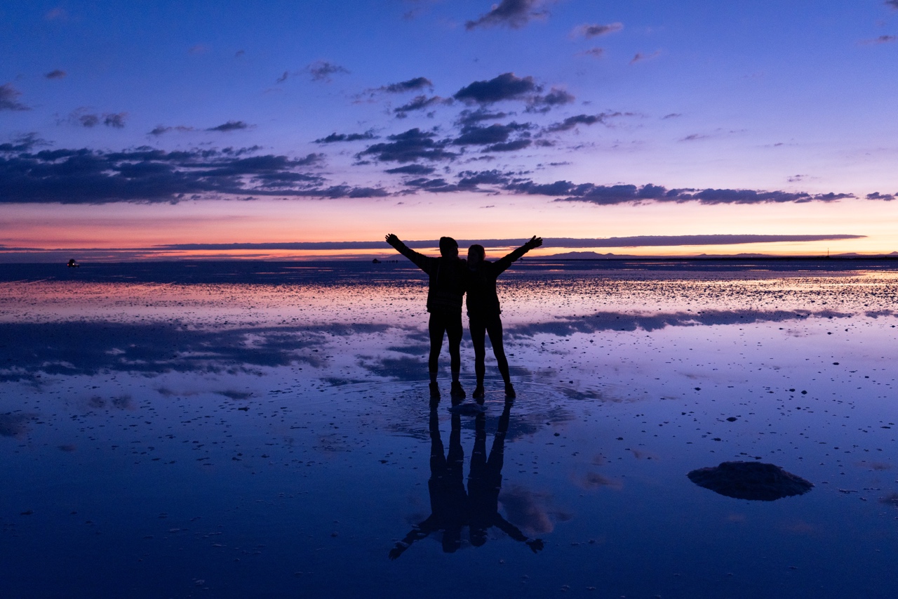 We woke up before 5 am, quickly dressed, and loaded the van by 5:20 a.m. We were on the road by 5:30 a.m., heading towards the salt flats. It was pitch black, but the drive to the salt flats only took about 20 minutes. Elvis found a spot on the flats that still had big puddles leftover from the rain and pulled over. Despite the freezing cold temperatures, we hopped out of the warm car to take photos. The sunrise was truly breathtaking, and the reflection of the brilliant colours in the big puddles made the scene all the more magical. Elvis directed an entire photoshoot and video shoot with his signature wacky pose suggestions. I was also able to fly the drone and get some incredible shots from up above as well.