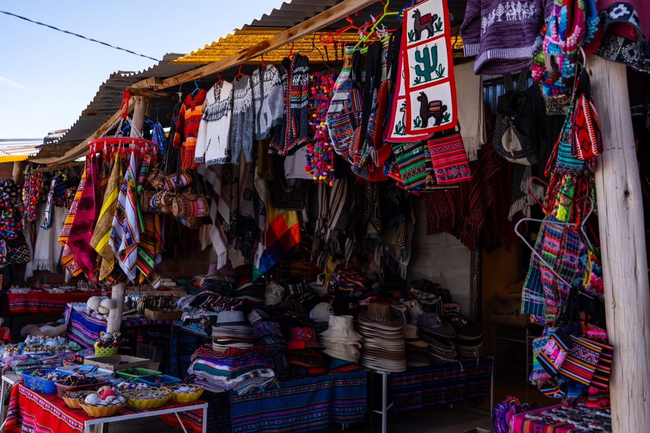 After a few quick photos, we drove to the village of Colchani, where they had a big local market with tons of hand crafted goods. We found a beautiful turquoise blanket with llama and Pachamama patterns in a shop. We had seen a blanket that we loved in Peru but didn’t end up buying it, so we had really made it a goal to get a nice hand crafted blanket before we left South America. This one was perfect!