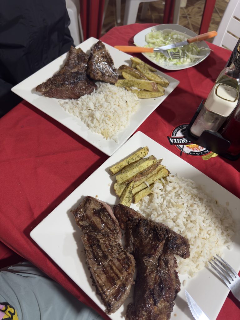 That evening, we found a local churrasqueria with great reviews, so we decided to give it a try. The incredible smell of barbecued meat greeted us, but they told us they didn’t accept credit cards and we were completely out of cash. We decided to have Saz wait at the restaurant as I went out to try to find an ATM, but that proved to be an adventure in itself. I walked to 4 different ATMs all around town that each had their various problems. The first one had a glitch on the screen which made it unusable, the second didn’t accept foreign cards, the third had a homeless man sleeping in the ATM booth, and the 4th kept freezing as I was trying to take out money. FINALLY on the 5th ATM I was able to take out cash, and ran back to Saz. It was honestly worth it, because that steak was without a doubt the most amazing steak we had ever tasted. We each ordered the steak, and got a huge slab of meat that came with a side of salad, rice, and fries, and it cost the equivalent of $6 USD per person.