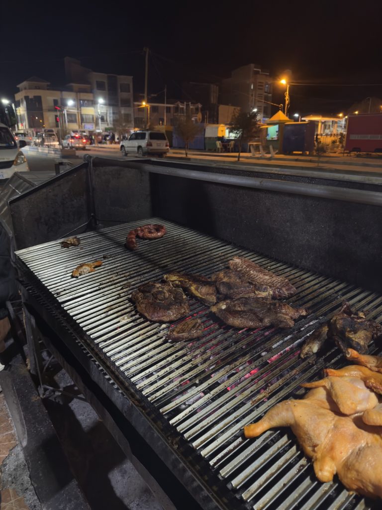 We enjoyed a Bolivian specialty dish for dinner that included fries, beef, tomatoes, onions, and sausage. The meal was delicious, and they even served us a bottle of Chilean red wine. We shared a glass with Elvis and finished the rest with the group. Dana and Steffi also brought a bottle from San Pedro, so we had a fun little wine night together, wrapping it up around 9:30 p.m. in preparation for our early start the next day.