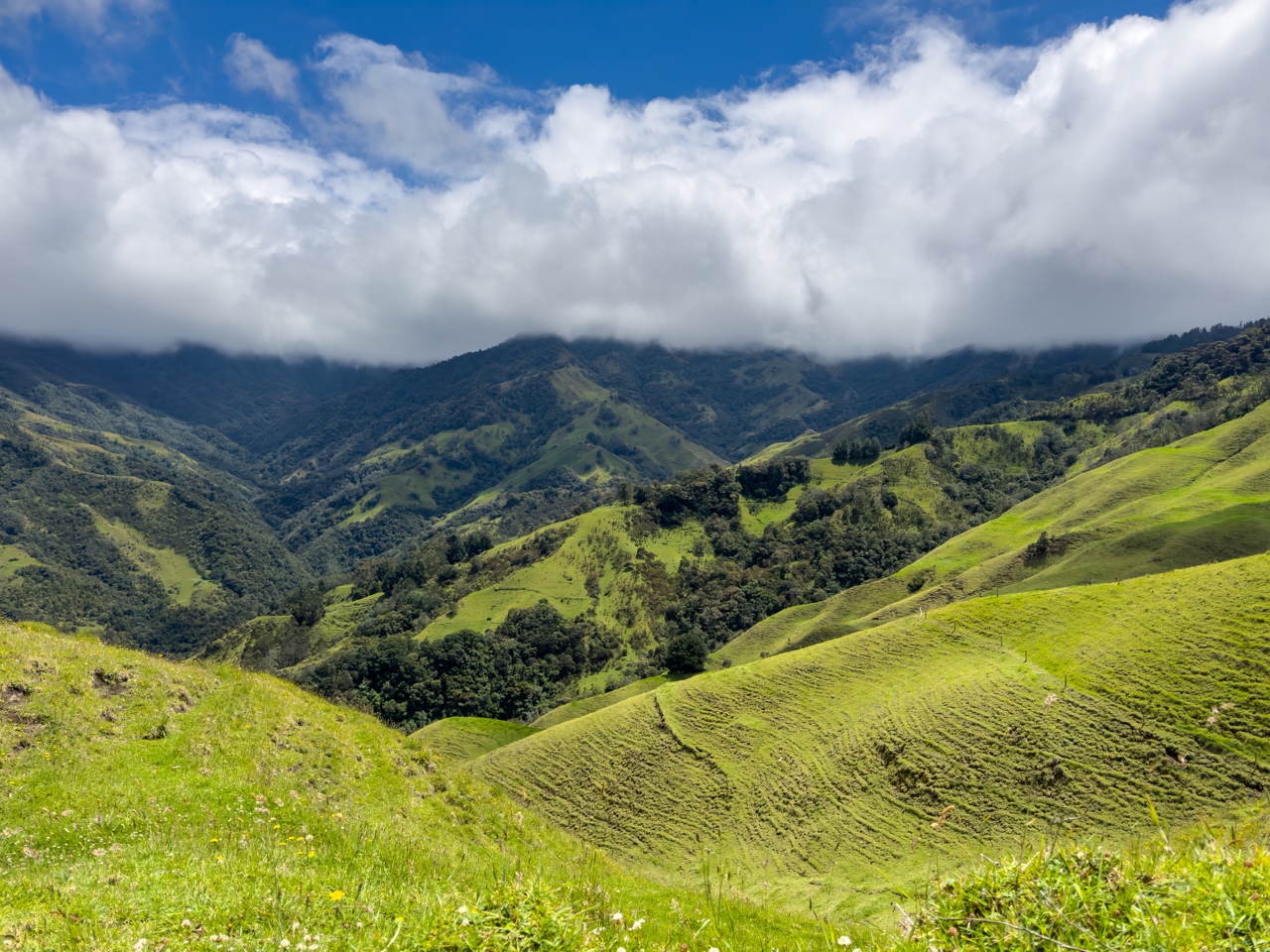 The scenery on the way down was absolutely unreal – we went from misty mountain top drizzle to what looked like Swiss mountainside with blue sky, green fields as far as the eye could see, and lots of cute cows! We took lots of breaks to take photos and enjoy the views, and got an opportunity to chat with Eduardo.