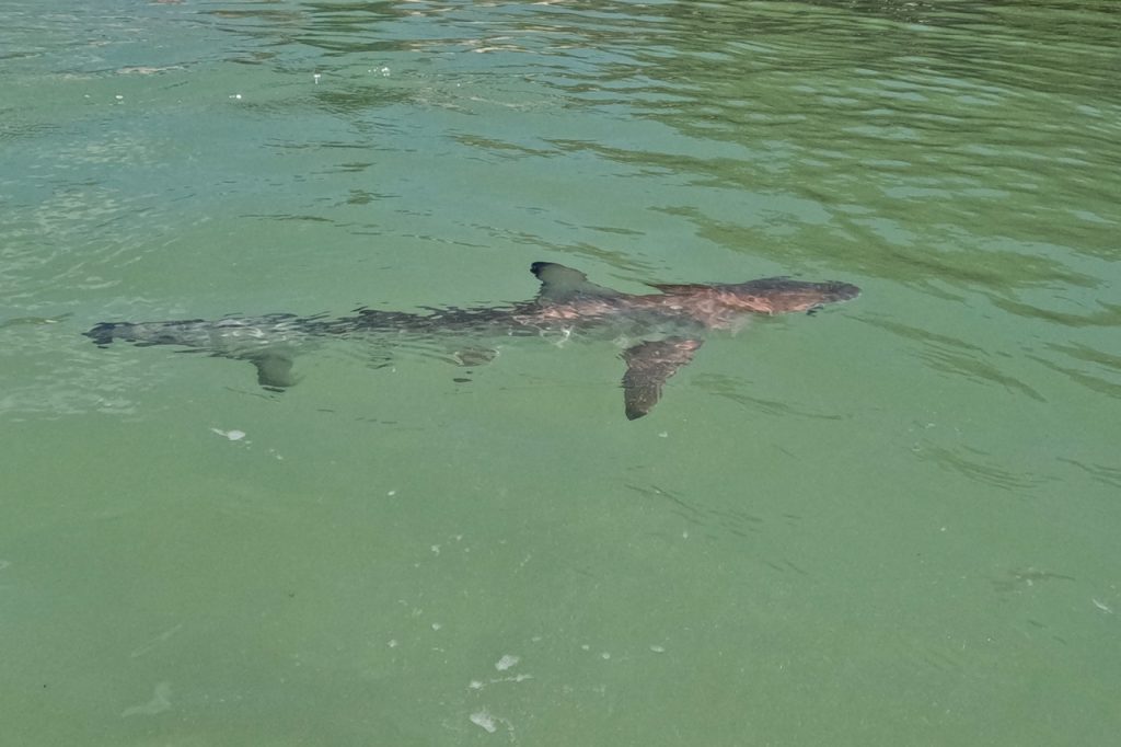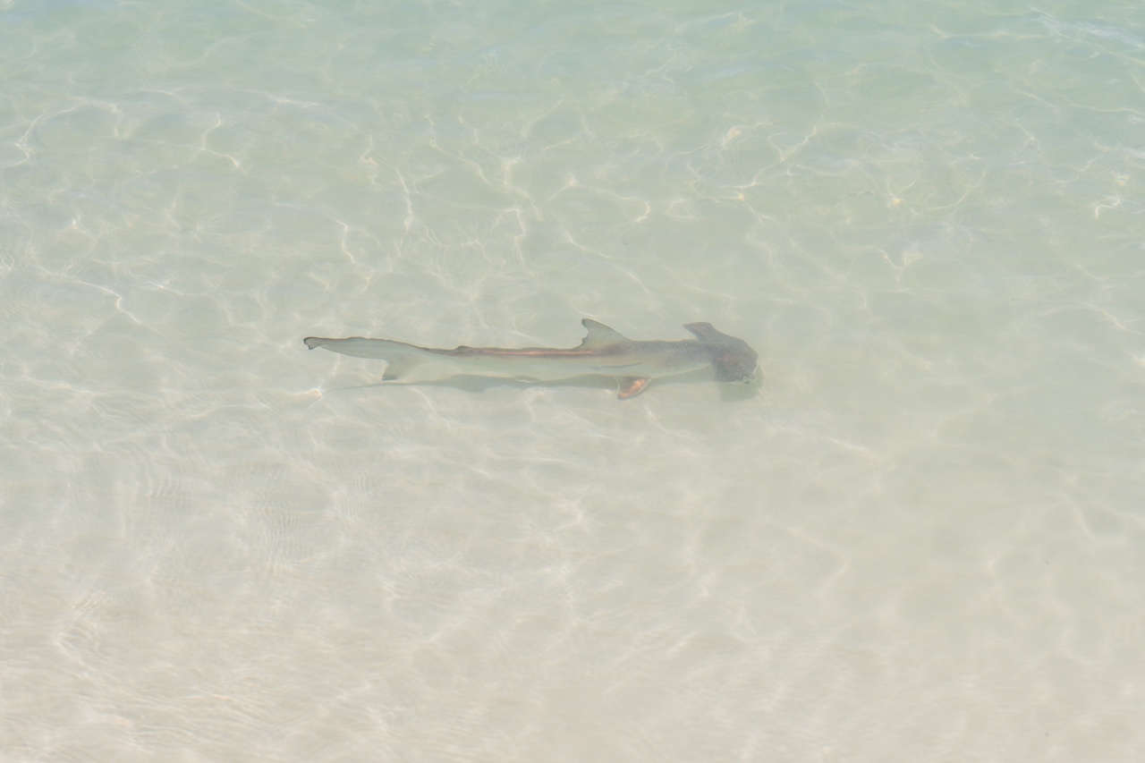 As Saz and Cheryl were floating and talking in the water, I headed back to the beach to grab a snack and some water. As I was sitting and relaxing on the beach, I saw something swimming very fast in the very shallow waters. I got closer to see what it was…and was absolutely blown away to find that it was a baby hammerhead! I shouted, “BABY HAMMERHEAD!” to get Saz and Cheryl’s attention, and they rushed over to see the tiny scalloped hammerhead swimming near the shore. It was magical! We followed the little shark around, snapping pictures and marveling at how relaxed it seemed with all the people around. He was so cute and seemed to have the zoomies, swimming spastically in a zig zag shape all along the beach.
