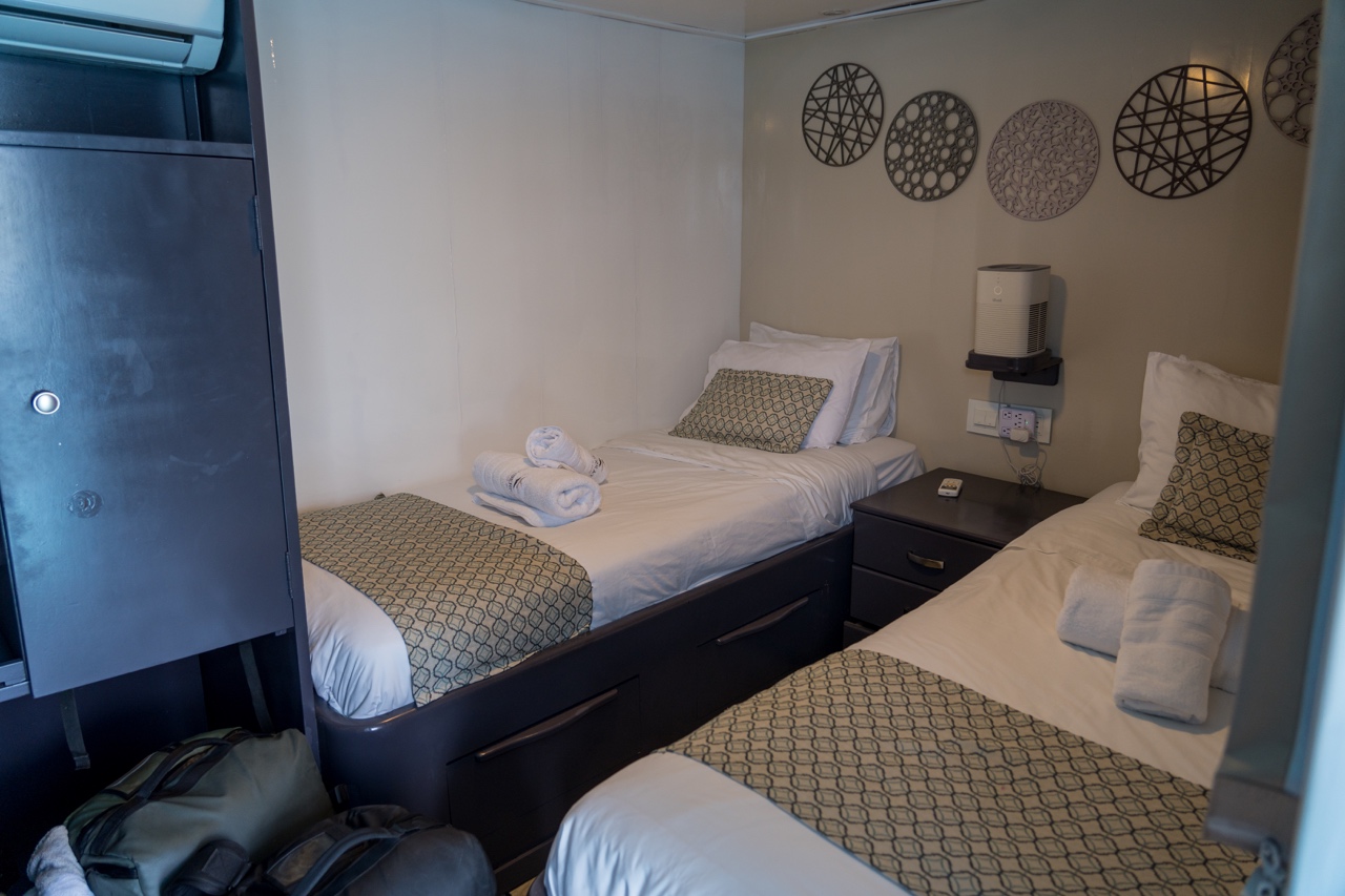 Just before 1 pm, we made our way to the dock to meet our boat. There were a couple of people with luggage waiting, and soon our guide, Jorge, arrived. He introduced himself and helped us onto a small zodiac boat that would take us to the main vessel. Once aboard, we were shown to our room, which was on the second floor with a window, twin beds, and a nice-sized private bathroom. We settled in, got organized, and then went downstairs for lunch with a few of the other passengers: Lars and Marie from Sweden, and Megan from the U.S.