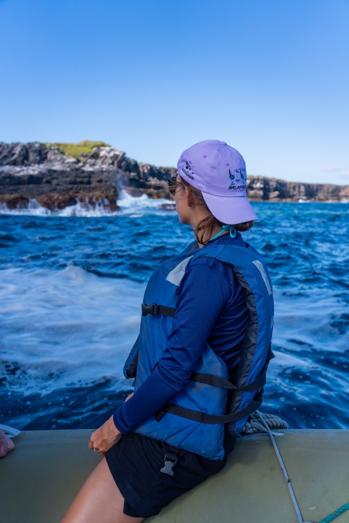 After a 20-minute wait, we finally boarded our dinghy, and it drove us out to our beautiful yacht. We were told to relax and enjoy the views and drinks as our yacht drove us to North Seymour Island. We were laying on the front desk of the boat, taking in the gorgeous views when a strong gust of wind blew my hat off straight into the ocean. Backstory on my hat – I bought a cute pink hat at Decathlon in Malaysia and about a week after a bought it, it mysteriously fell out of our backpack in Paris on the way to the Eiffel Tower. I went back to Decathlon in Paris to replace the exact same hat, and low and behold I had now lost it again. Truly a cursed hat (but that didn’t stop me from buying it a 3rd time).