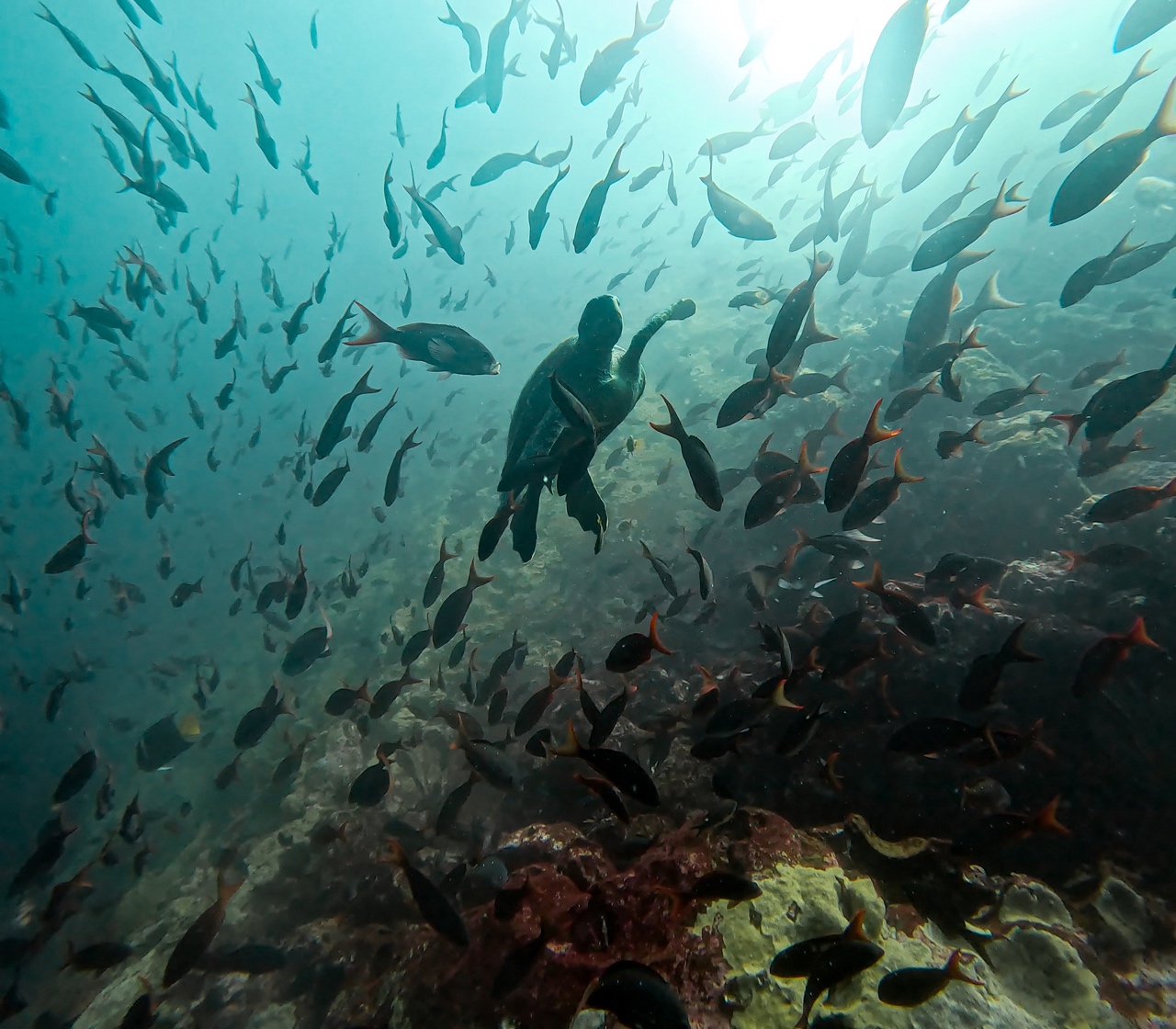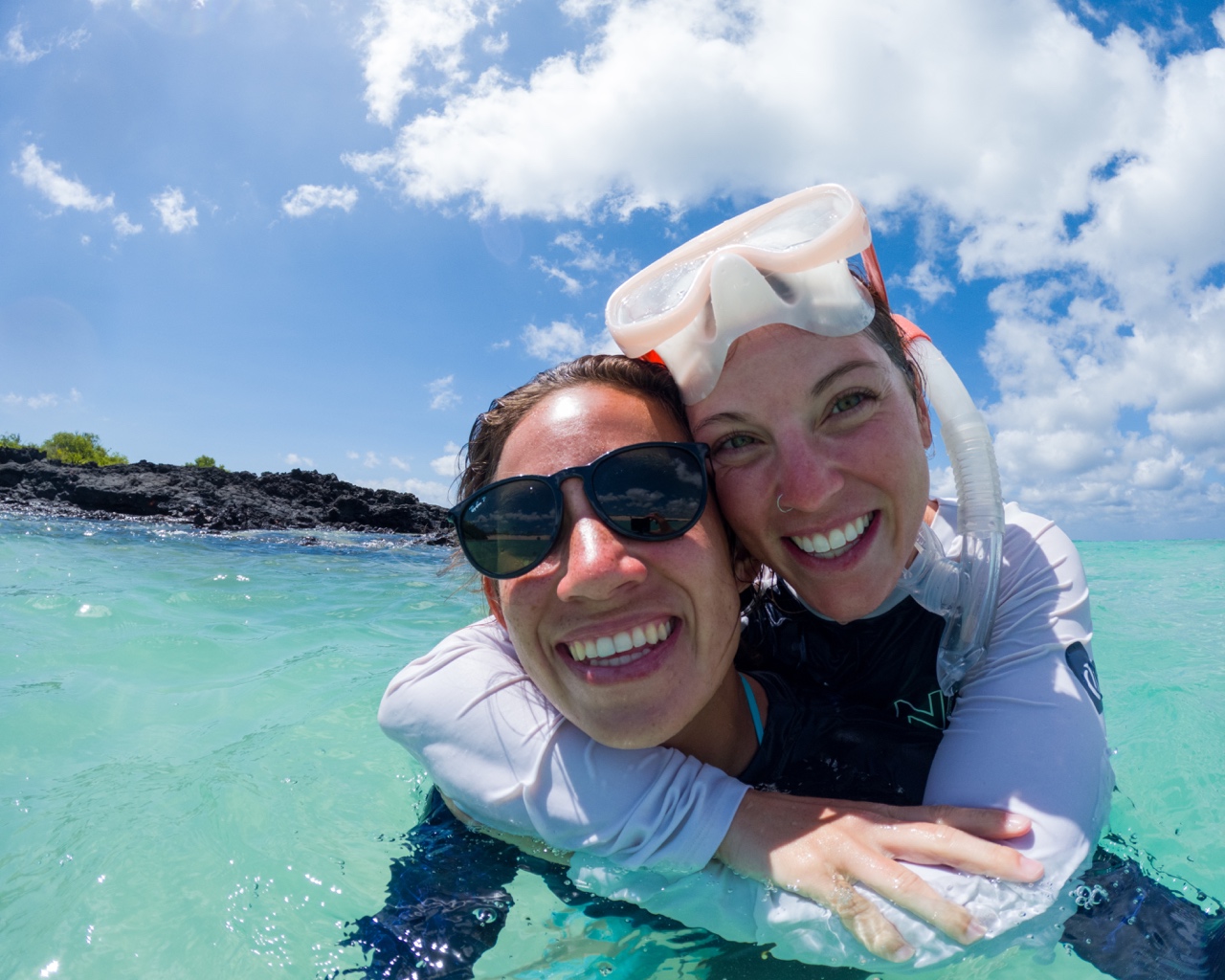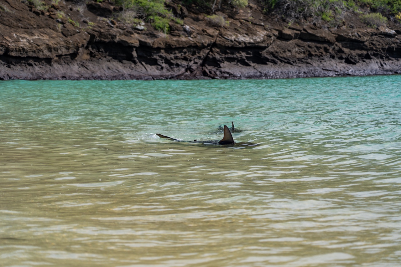 After a sweaty 1.5-hour trek, we were super excited to return to the boat for some snorkeling. Jumping into the water felt like heaven after roasting in the sun all morning — crystal clear, the perfect temperature, and the visibility was insane. We swam along the rocky cliff of North Seymour, spotting at least five or six sharks. Sazzie even had a face-to-face encounter with one! It was by far the best snorkeling of our Galapagos trip.