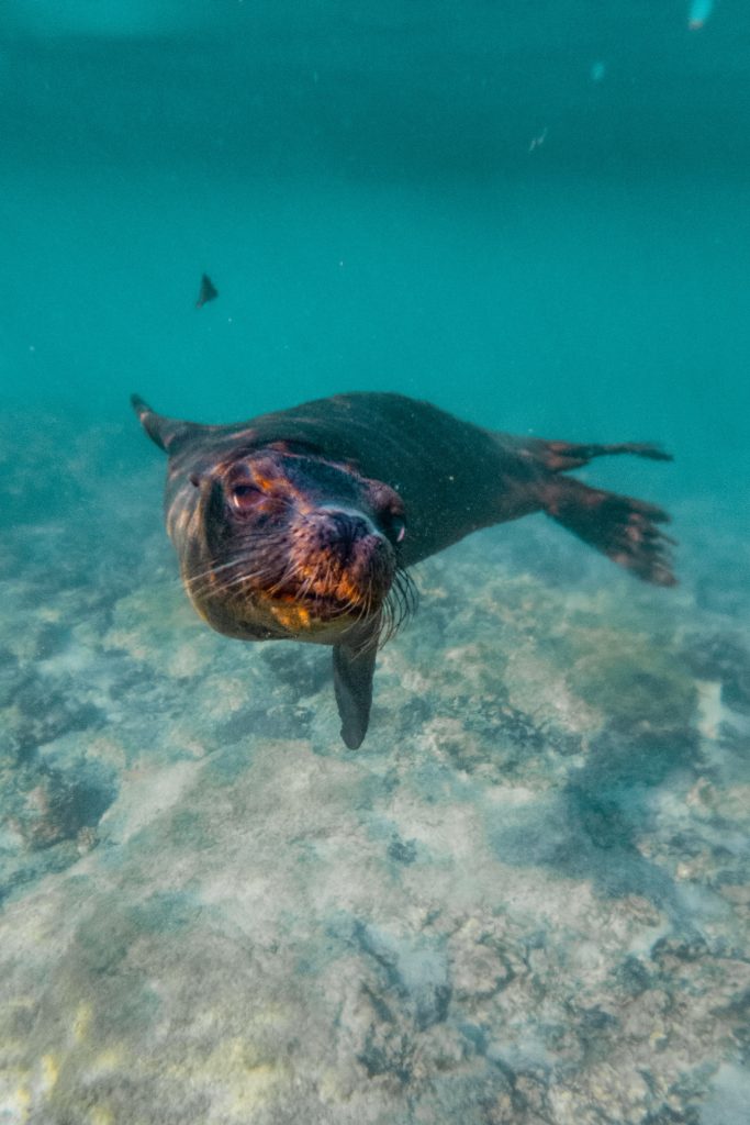 Back on the boat, we were treated to juice and cheese empanadas before heading out for a second snorkeling session. This was easily the best snorkel of the trip! The previous snorkel was off the beach so there was still some sand making the water murky, but this spot was a zodiac entry direct into a dropoff… and the water was absolutely stunning. We spotted more beautiful fish, a flatfish, and sea lions. Most people had already gone back to the boat, but we ran into a group of adorable and playful sea lions, so we swam and played with them for a little extra time.