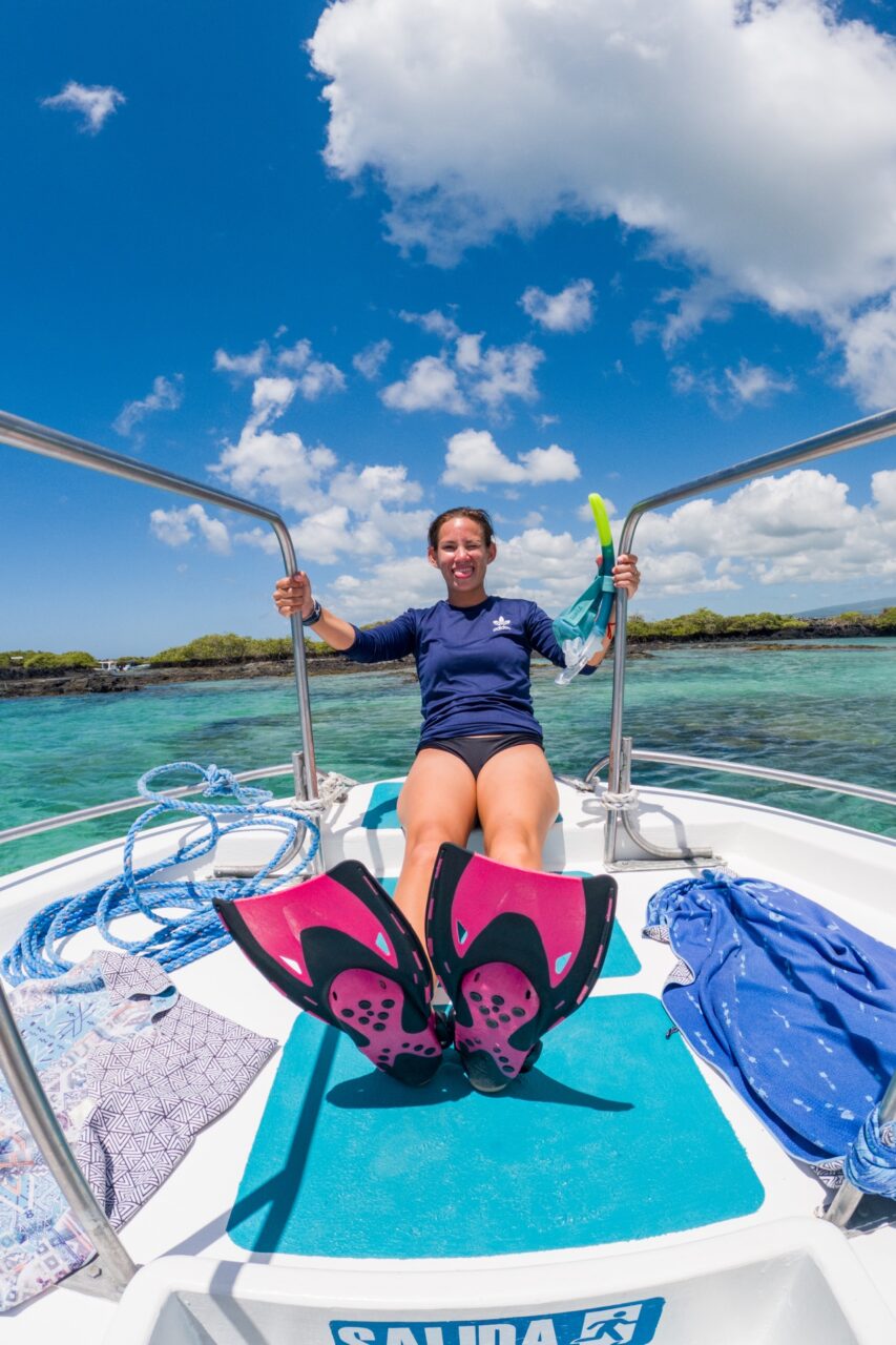 Our ride arrived around 11 a.m., taking us to an office where we were fitted for flippers. I quickly realized I should probably get a rash guard to protect myself from the brutal sun of the day, so I ran next door to buy one from a local store. We piled into the truck bed and were driven to the pier, where sleepy sea lions dominated the dock. Onboard, we met our guide, Carlos, and the crew, Roberto and Marco.
