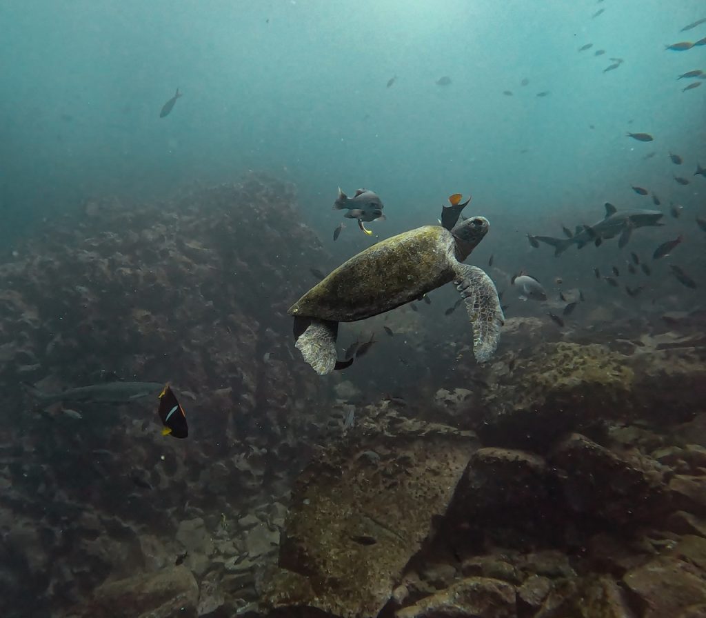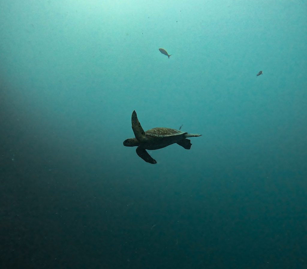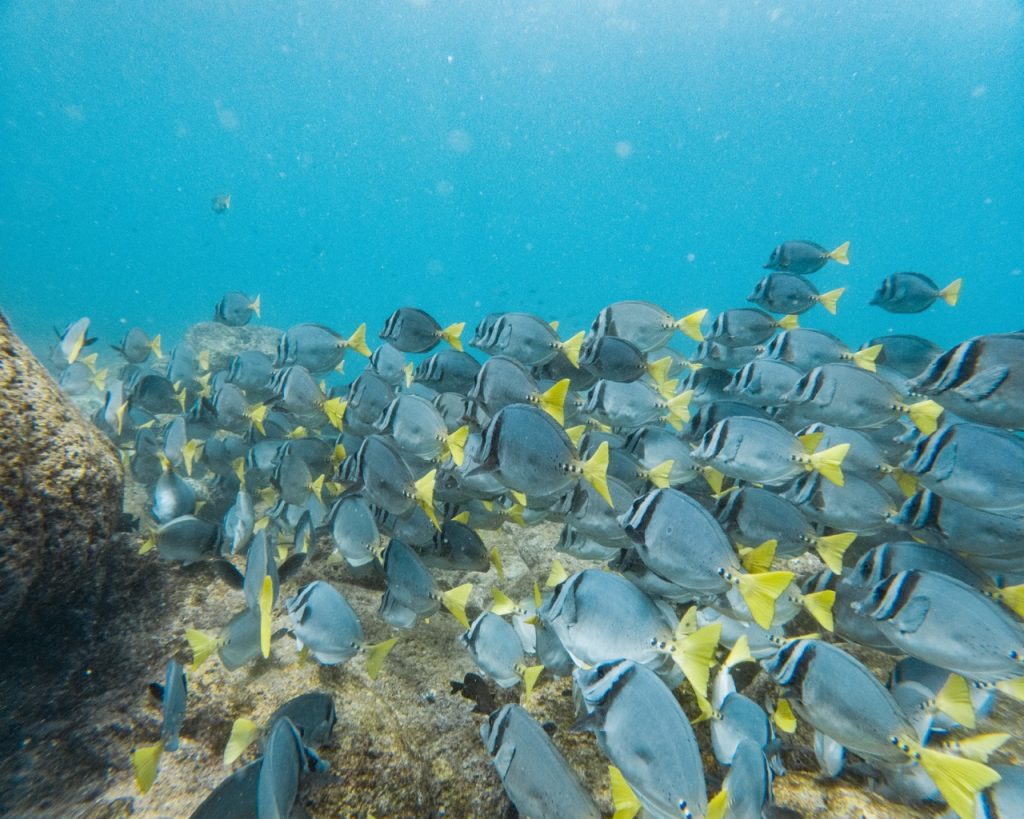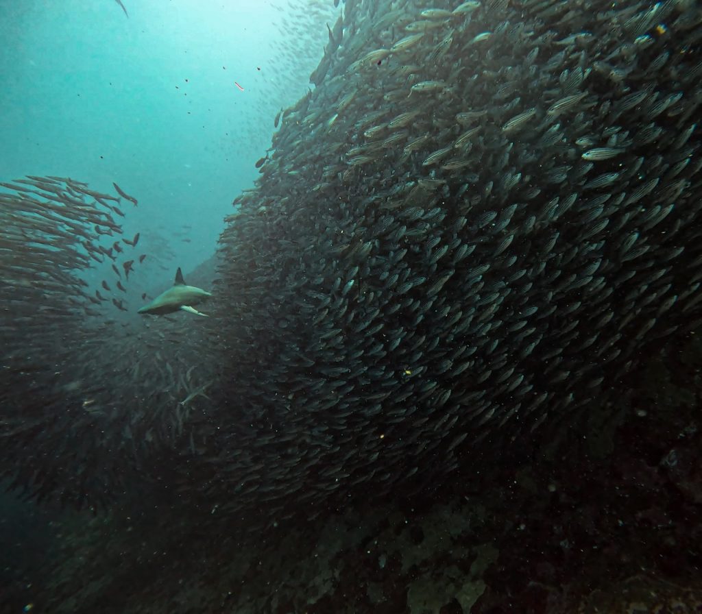 When we finally descended into the water at Kicker Rock, all of our nerves instantly vanished—visibility was incredible and we were instantly surrounded by playful sea lions, fish, bait balls, reef sharks, and even hammerheads! We saw at least 10 hammerheads, many eagle rays, sea turtles, sea lions, and a massive bait ball of fish. It was surreal! It was also quite different than the tropics diving we were used to in Asia. We had seen some incredible stuff in Raja Ampat, Indonesia, but it was more macro with colourful corals. In the Galapagos, there was far less coral and it was much darker, but the giant sharks and sea lions and rays were absolutely magical to see.